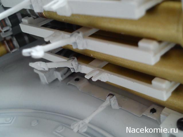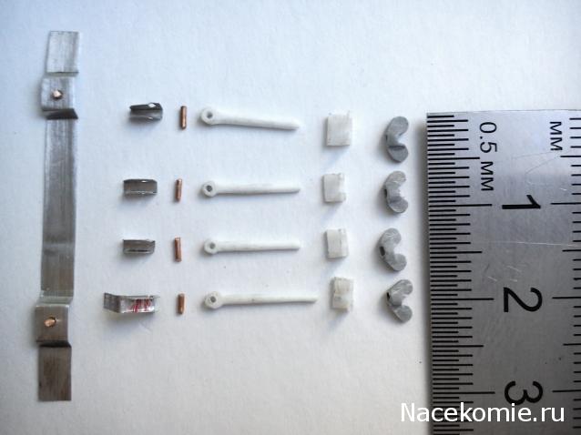 Все сделано очень просто! За основу брал канцелярскую скрепку (обычную), она как раз подходит под масштаб, нарезал ее на несколько абсолютно равных частей. С креплениями замарачиваться не стал, просто вылепил из двухкомпонентной шпатлевки аккуратненькие квадратики, и пока она липкая просто приклеил их на стеллажи, попутно отрезанные скрепки вставил в эти квадратики (шпатлевка пластичная, напоминает пластилин). В ответной части, где находиться барашки (зажимы), в стеллажи по вставлял медную проволочку, потом естественно окрасил в белый цвет! Барашки (зажимы вверху), изготовил из скрученных воедино тонких жил провода. В заключении все покрасил! Где должна быть резьба красил матовым алюминием XF-16. Если что-то непонятно - пишите объясню!