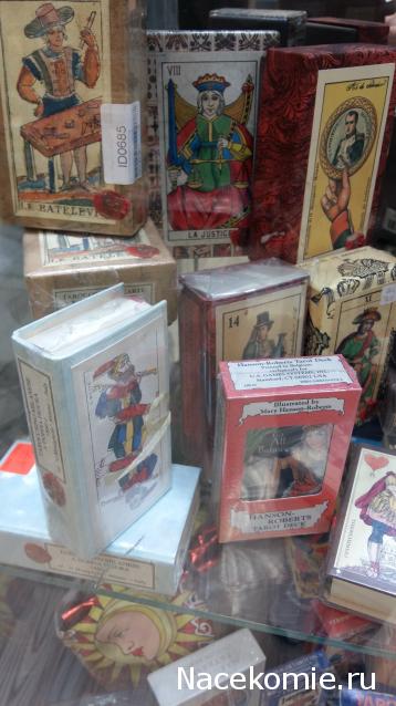 Зайдя внутрь, я испытал своеобразный культурный шок, по обе стены магазина ( на фото только одна сторона магазина, но на другой не меньше) с пола до потолка расположены колоды Таро, которые, узнав дополнительно у владельца, можно приобрести, цены от 19 евро за ЛоСкарабео и до нескольких сотен евро за редкие колоды. К примеру, Таро Данте, которое я бы хотел приобрести, стоит около 60 евро, испанскую версию Джейн Остин можно приобрести за 46 евро. Колоды ЛоСкарабео представлены в основном испанском варианте, но очень приличного ( старого) качества Ло.