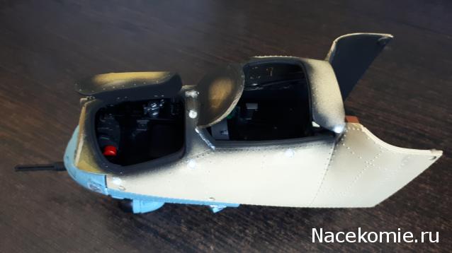 Накидаю сюда фото пилежа модели. Перекрасил интерьер и приборные доски. Повесил дверь на пластиковые штырьки и сточил петли. Развернул петли двери оператора и вклеил их. Делаю гидроцилиндр двери пилота. Срезал петли крепления стекла и залил отверстия на стекле Micro Kristal Klear. Придал объём приборке с помощью колечек из проволоки. Покрасил отражатель фары. Заклеил отверстие на пушечной установке. Перекрасил крыльчатку и вал на двигателях. Не использовал 2 светодиода на так называемые фары, т.к. это не фары. Эти 2 вывода буду использовать для моторчиков, которые будут крутить винты. В планах сделать тумблеры и педали. Жгуты проводов и прочую мелочёвку. По креслам пока не определился, если будут пилоты, то наверное нет смысла их дорабатывать, если не будет пилотов, то нужно будет делать ремни и прочее.