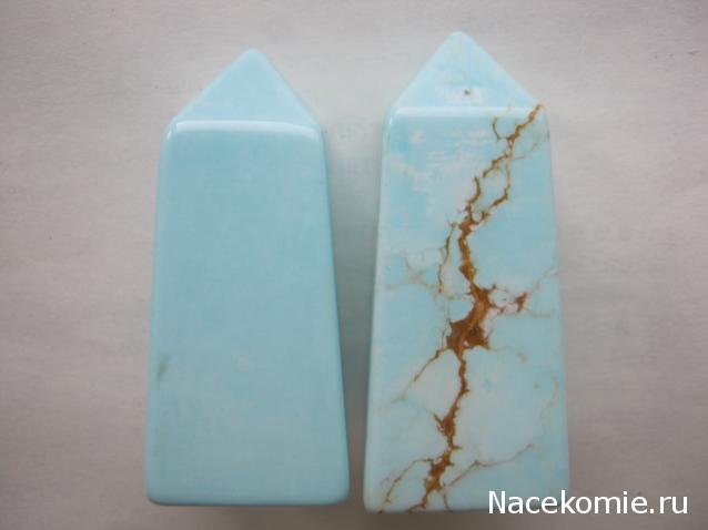 Сегодня прикупил все таки номер журнала с Голубым Хаулитом.. Странное название, мы как то больше привыкли к названию Говлит. Но это просто тонкости перевода. По английски пишется "howlitе", а произносится везде по разному.. Вспомнился анекдот про этот язык ) "В английском языке пишется одно, а читается по другому. Там например пишется Ливерпуль, а читается Манчестер !))"... На самой коробочке есть надпись, Имитация бирюзы. Сам камешек имеет четкую форму обелиска с ровными гранями, цвет практически голубой и там заметны поперечные светло-зеленые прожилки, особенно хороши они видны на подошве минерала. Видел и в других киосках, но там просто полностью голубой без всяких оттенков, смотрится просто как кусочек голубой пластмассы.