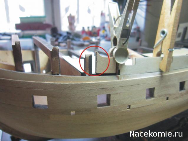 files/201303/31736_bb6d0db14e02224c6a52ff43f56c3ea3.jpg Вот такое получается у всех. Но у тебя сборка немного не по порядку. Сначала приклеивается наружный фальшборт, потом вставки на пушечные порты, потом внутренний фальшборт. Вот это деталь, которая не доходит до ветвей шпангоута так и останется. Образвавшуюся щель между ней и ветвями шпангоута я заделал рейкой 4х2мм заподлицо с внутренним фальшбортом. Потом всё равно изнутри и снаружи обшивать начисто. Чистовая декоративная обшивка скроет все дефекты и получится КОНФЕТКА!