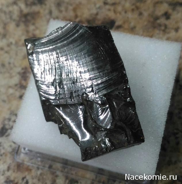 Не удержалась и заехала в киоск. Покопалась в коробке. Опять мелочь мелкая. Выбирала только из двух - покрупнее и средним. Выбрала в итоге средний, потому что он с интересными следами деформации (видимо, от ударов инструмента при раскалывании) - для изучения. Вообще я раньше шунгит даже в руках и не держала (на выставках никогда не привлекал внимания). А этот - точно шунгит? Надеюсь, опытные форумчане определят. А пока могу сказать, что минерал очень легкий, блеск со всех сторон стеклянный, цвет металлик а-ля гематит из ЭК, в общем по фактуре похож на картинку с обложки, только форма другая.