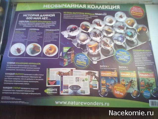 И так! Начнем с путеводителя по изданию! В серии обещают очень много интереснойстей, из них, скорпионы, рогачи, стрекозы, осы, бронзовки, сверчки,губки, маллюски, археоптерикс, халькопирит, опал, тигровый глаз, турмалин, уранинит, изумруд, гематит, и др! В журнал был вложен лист о подписке! Со 2 доставкой папка, с 4 - гигантский жук, с 6 - кейс! Ну это все знают!
