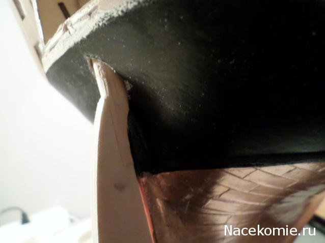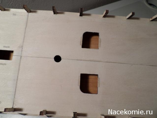 В журнале предлагалось делать "колодцы" для трапов на орудийную палубу. Я сразу отказался от этой глупой затеи и сделал фальшпалубу под основной, наклеил палубный настил напротив люков и заклеил заподлицо вырезы в люках для колодцев. На фотках почти зачищенный корпус. Топтимберсы обрезаны заподлицо с палубой. Профиль бортов остался неизменным.