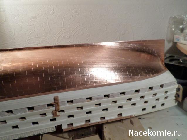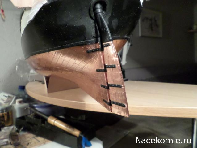 Наступила очередь медной обшивки днища перед покраской корпуса. Для обшивки использовал медную ленту на клейкой основе. Под неё подготовил днище - прошпаклевал до идеально ровной поверхности и загрунтовал вместе с корпусом. Обшивку начал от киля и гнал её вверх до ватерлинии. Ленты приклеивал по одной с каждого борта, чтобы сохранить симметричность. Пластины отмечал надрезом ножа. Ленту по всей длине приглаживал для плотного приклеивания брусочком бальзы, у кого нет - можно простым ластиком. Из рулона 33м осталось примерно 1/4. Потом покрыл всё днище в два слоя цапонлаком прозрачным для предохранения от дальнейшего потемнения и царапин, заодно и укрепил весь медный слой.