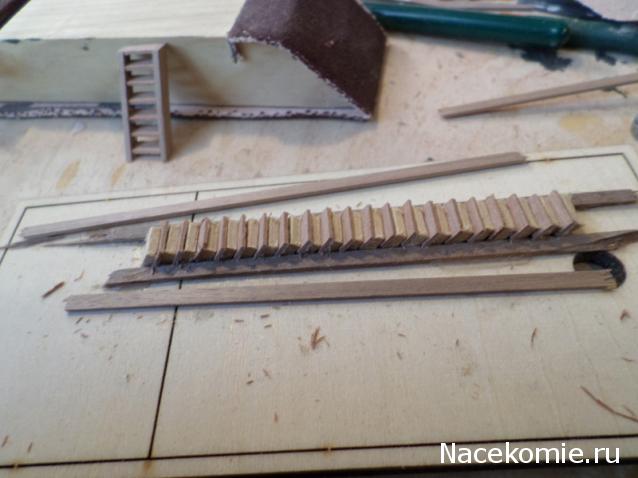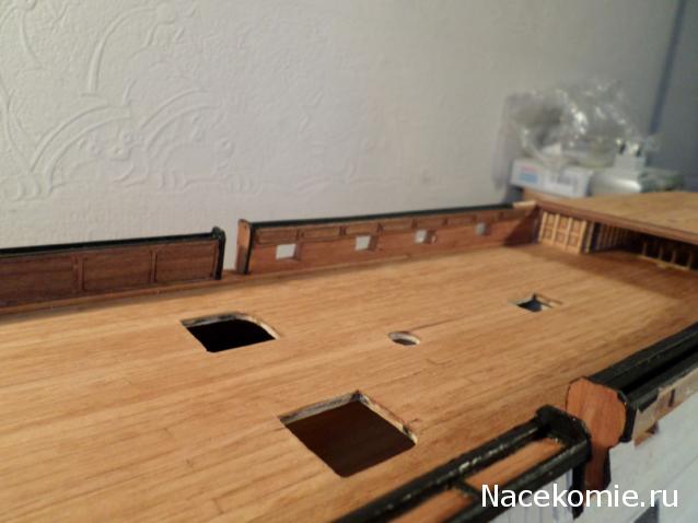 Коечные сетки изготовил из реек черновой обшивки. На носу согнул утюгом по профилю планширя. Фалрепные доски изготовил свои из груши, покрасил чёрным акрилом, сделал бортовой трап. Для него использовал рейку2х1 и подпорку 1х1мм. Корпус загрунтован грунтовкой Revell под покраску. Палуба и борта изнутри покрыты в один слой шеллаком на спиртовой основе. Декор по бортам изнутри сделал из ореховой рейки 4х0,5, окантовка - орех 1х0,5мм. На шкафуте декор выклеивал на кальке, обрабатывал в пакете.