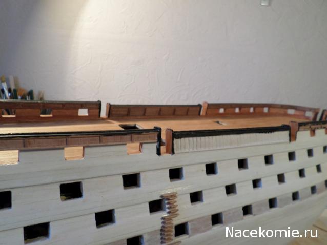Внутреннюю отделку бортов и пушечных портов на палубе начал делать рейками от черновой обшивки. Заодно и откорректировал по месту расположение портов на палубе.