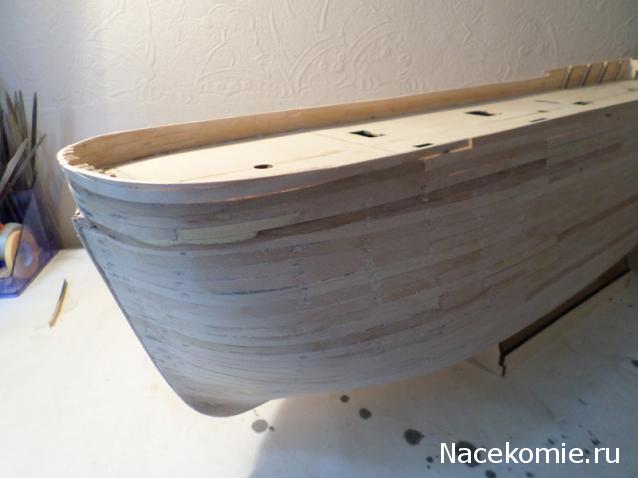 Начинаю свой фотоотчёт о проделанной работе. Про сборку корпуса уже много сказано, много сломано копий (оружие такое...). Свой корпус я собирал без всякого стапеля. Начал с килевой рамки, склеил её, потом вклеил шпангоуты. Топтимберсы шпангоутов не правил, оставил так, как есть. После установки палуб всё выправилось в одну линеечку, палубы встали, как литые. Ветви топтимберсов, выступающие над верхней палубой были немного вкривь и вкось, но я не обращал на это внимание. Главное, что наружный контур профиля по бортам остался неизменным. Кроме того, я решил их обрезать, чтобы не увеличивать толщину борта больше, чем надо. Фотографии начинаю публиковать с черновой обшивки. Рейки временно прибиты гвоздиками, которые потом извлекались все перед зачисткой.