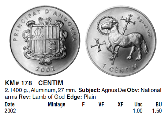 P.S. И немного лирики... Буду лаконичен как никогда - чоны только "Паровоз", монеты Андорры только "Агнец Божий" (и в журнале описаны только эти разновидности монет), все UNC. C`est tous. P.P.S. Итак, нас ещё ждёт "третья серия, заключительная" сантимов (скорее всего в 127-ом номере) и "вторая серия, заключительная" чонов в номере 1xx.