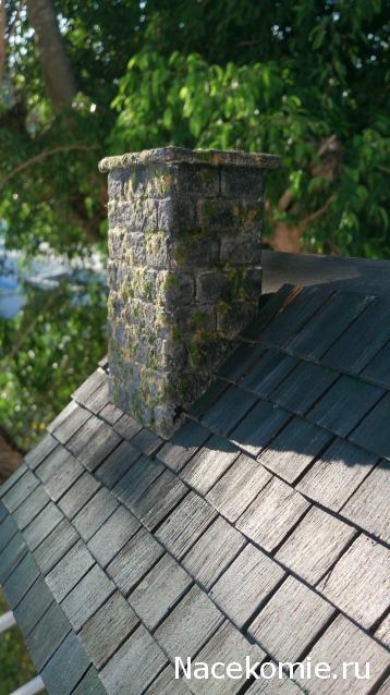 Вот погоди, я еще крышу закончу, я купила настоящий мох. порежу, покрашу, веточки к ней приклею. А еще у меня на балконе растет настоящее сандаловое дерево (мой бонсай)у него очень мелкие листочки, оторву, засушу и посыплю крышу.