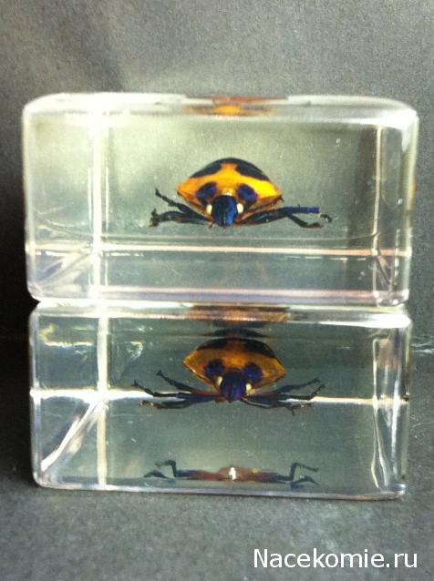 ))) Привет всем)))! Да, ничего не скажешь - клопик зачётный))) Вот и наша биологическая пара. Самка тоже, видать, с будущим потомством, а самец - из парикмахерской - с подстриженными усами))). Примечательно, что спинки этих маленьких жучков с тёмным пигментом очень интересно переливаются на свету сине-фиолетово-зелёным цветом))) Акрил хороший, на одном бруске - есть небольшие потёртости, но вид не портят. Вот только цена расстраивает очень-очень И, кстати, кто первым найдёт отличие в названии клопа на блистере и на обложке журнала???
