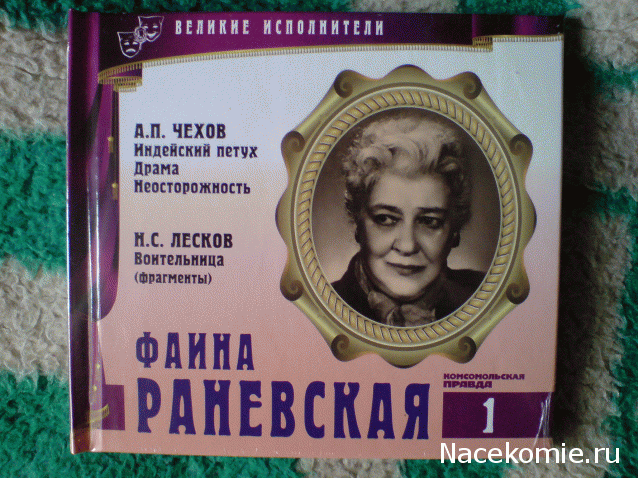 Вчера при покупке "Комсомолки" получил бонус в виде данного издания. Поледующие выпуски будут стоить приблизительно 100 рублей, как сказала мне продавец. Представляет собой буклет в твердом переплете, содержащий биографию Фаины Георгиевны Раневской с фотографиями (объем - 44 страницы). К заднему форзацу приклеен картонный конверт, содержащий компакт-диск с аудиокнигами произведений двух писателей в исполнении Фаины Георгиевны.