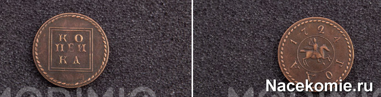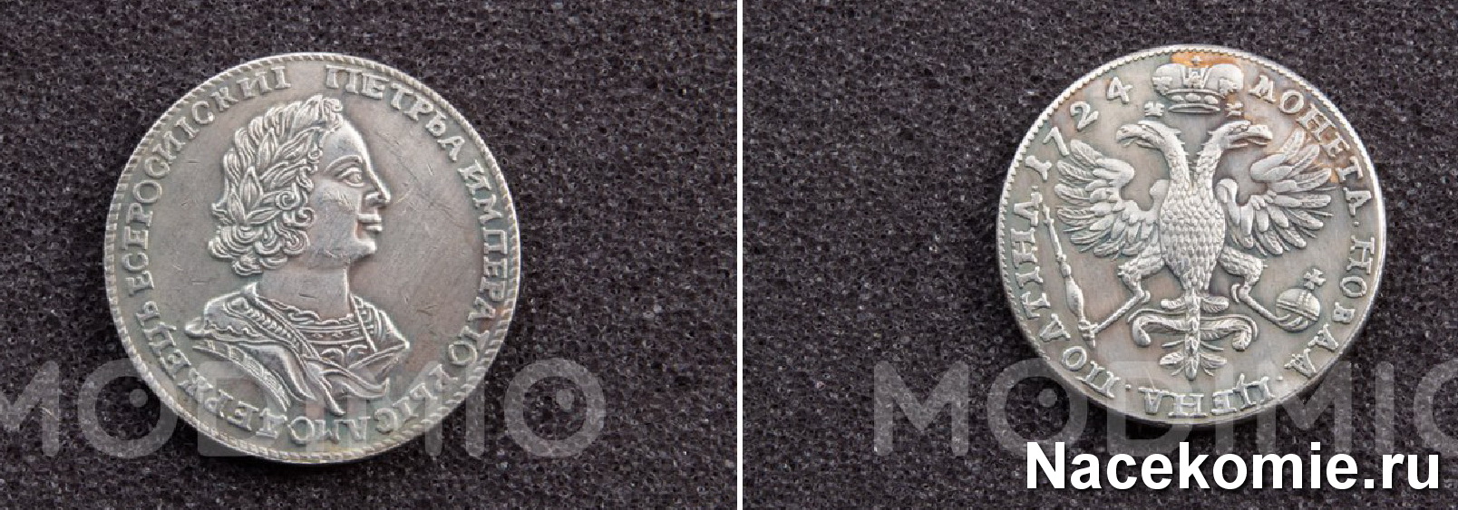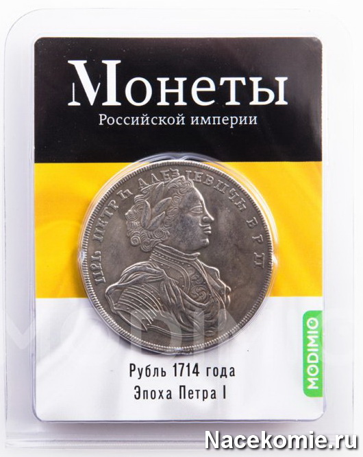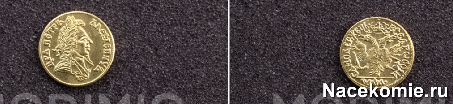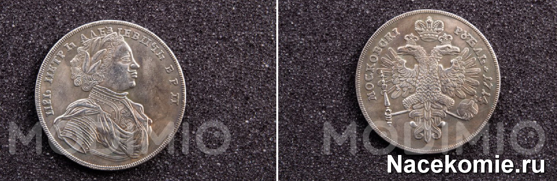 №1 – Рубль 1714 года. Первый герой, открывающий серию выпусков, посвящённых становлению монетной системы эпохи Петра I. Благородная монета украшена профилем первого императора в лавровом венке.